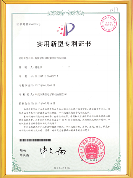 烟雾感应器实用新型专利证书