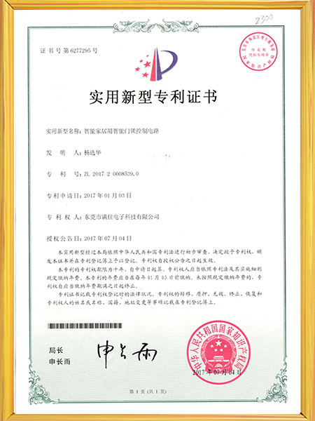 智能门锁实用新型专利证书