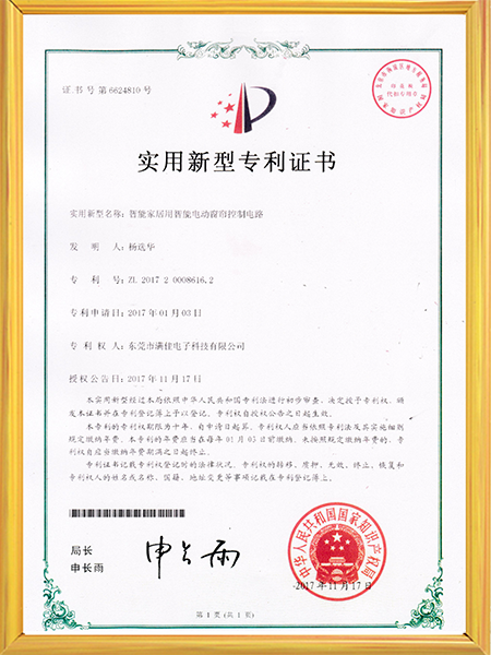 智能窗帘实用性专利证书