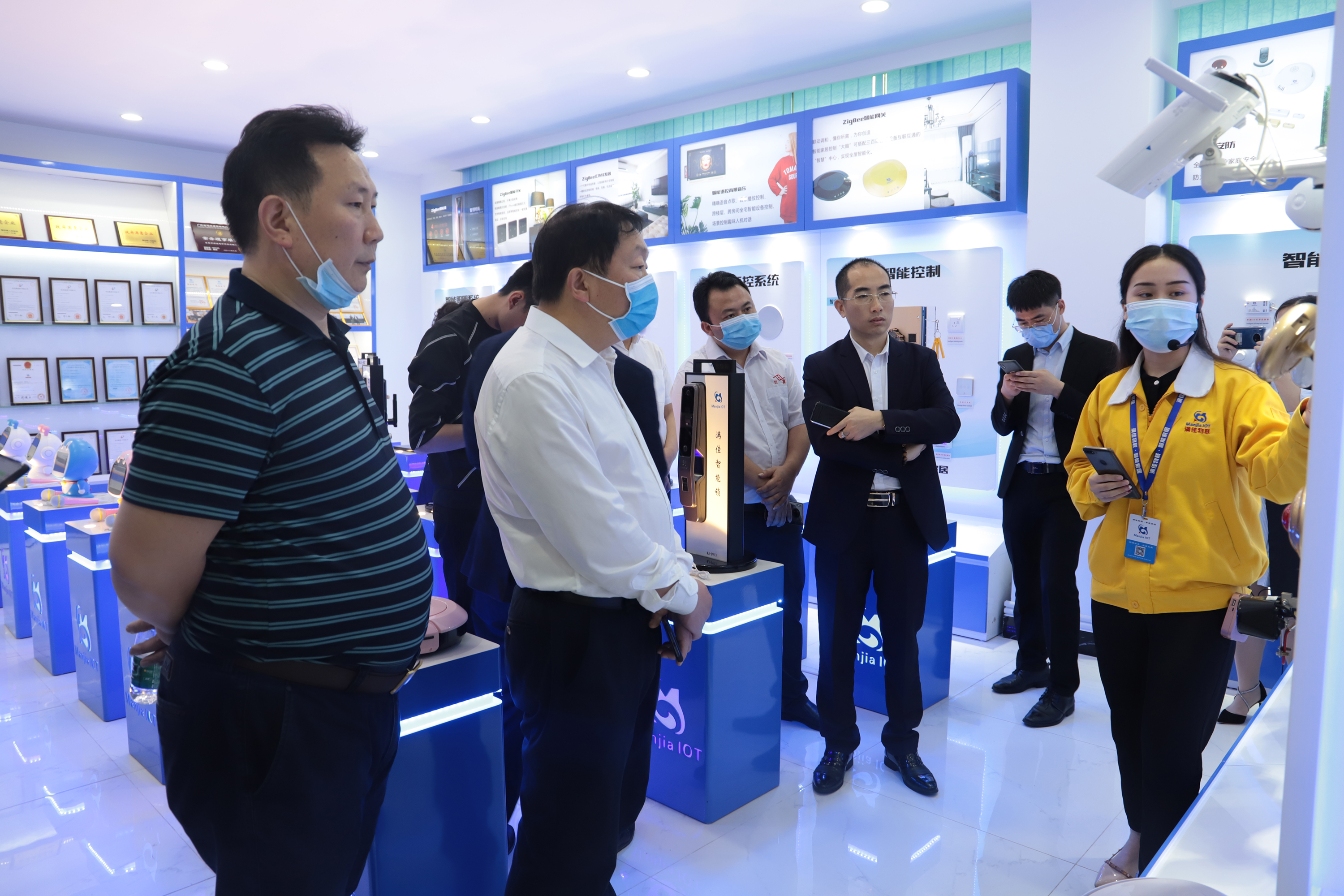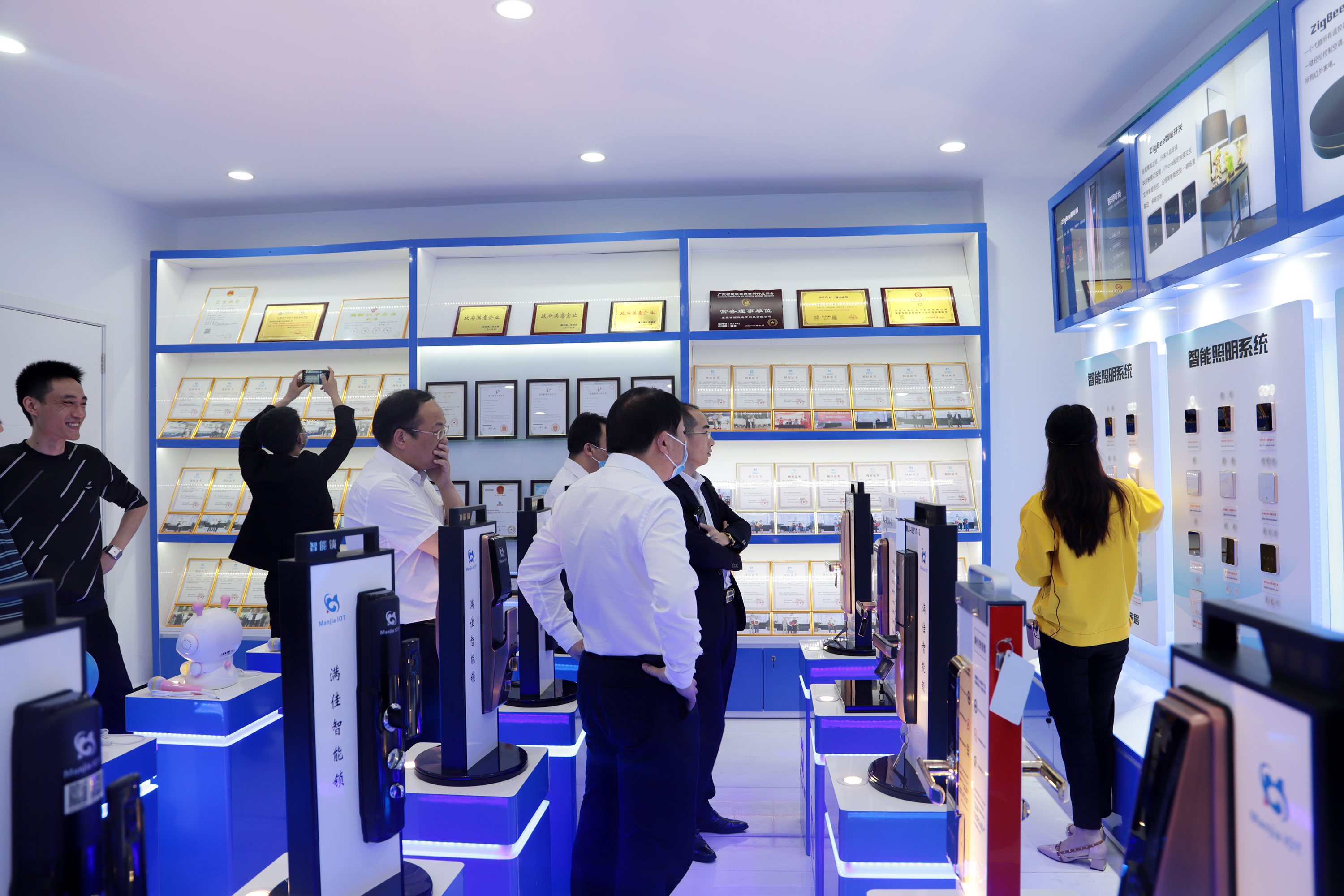 接着,新化县朱书记及多位领导进入满佳物联智能产品样品间及智能家居实景体验馆。首先对智能样品间进行了参观,满佳工作人员对我司智能产品功能给领导介绍。随即,又参观了智能家居实景体验馆,朱书记一行现场观看了智能家居操作演示,并充分肯定了我司在智能化研究技术水平。朱书记强调,智能化家居是行业大势,希望满佳能够积极发挥技术优势,为行业发展树立典范。进行一系列参观后,新化县委朱书记及多位领导,对满佳物联智能家居给予了充分的肯定,前景一片明朗!